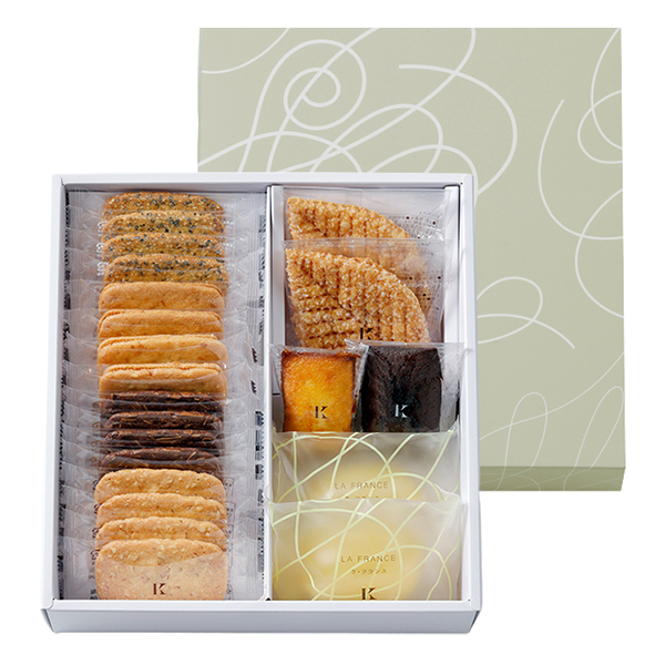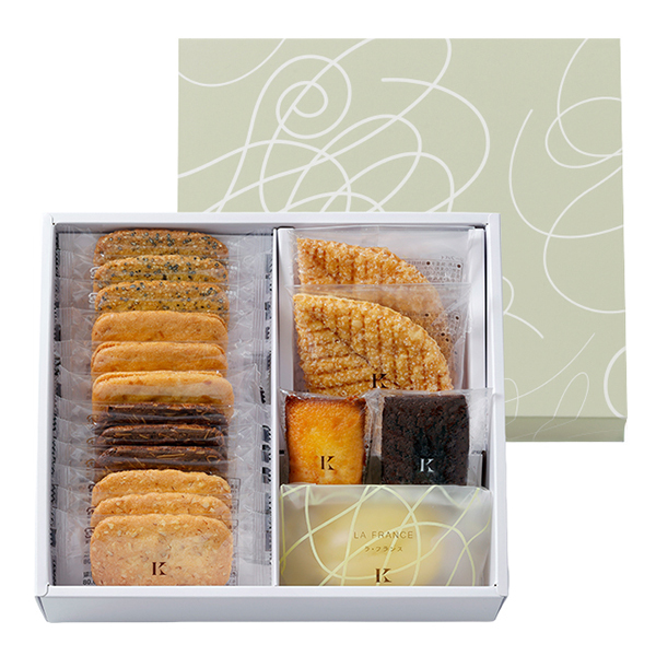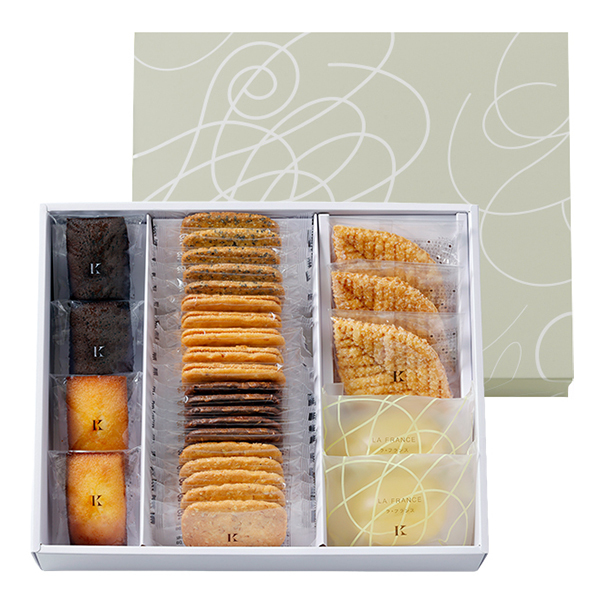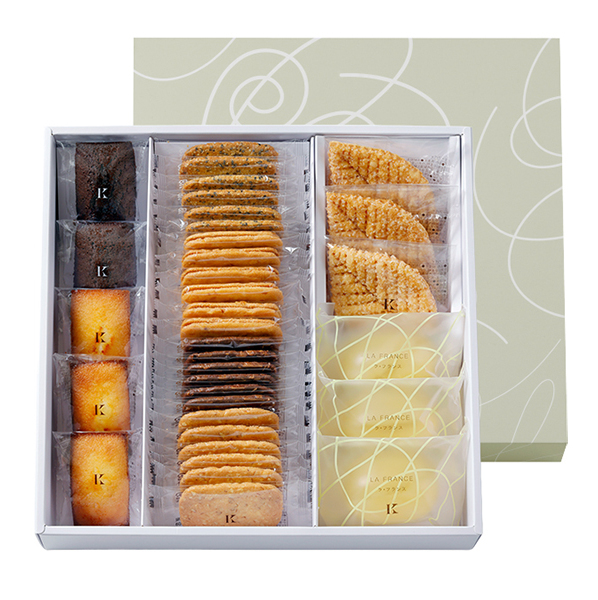 | 内容量 | 17個入:きのとやクッキー(アマンド・ショコラ・マカダミア・セサミ)×各3枚、リーフパイ×2枚、フィナンシェ(バター・ショコラ)、ラ・フランス×各1個 22個入:きのとやクッキー(アマンド・ショコラ・マカダミア・セサミ)×各4枚、リーフパイ、ラ・フランス×各2個、フィナンシェ(バター・ショコラ)×各1個 29個入:きのとやクッキー(アマンド、ショコラ、マカダミア、セサミ)×各5枚、リーフパイ×3枚、フィナンシェ(バター・ショコラ)、ラ・フランス×各2個 35個入:きのとやクッキー(アマンド・ショコラ・マカダミア・セサミ)×各6枚、リーフパイ、ラ・フランス、フィナンシェ バター×各3個、フィナンシェ ショコラ×2個 |
