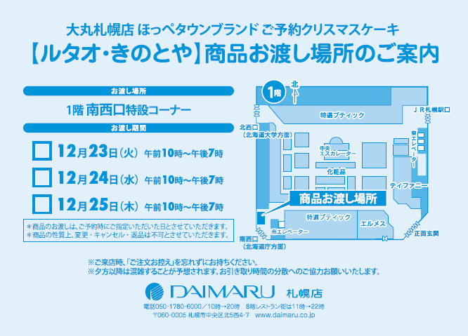 大丸店、丸井今井店のクリスマスケーキのお渡しについて