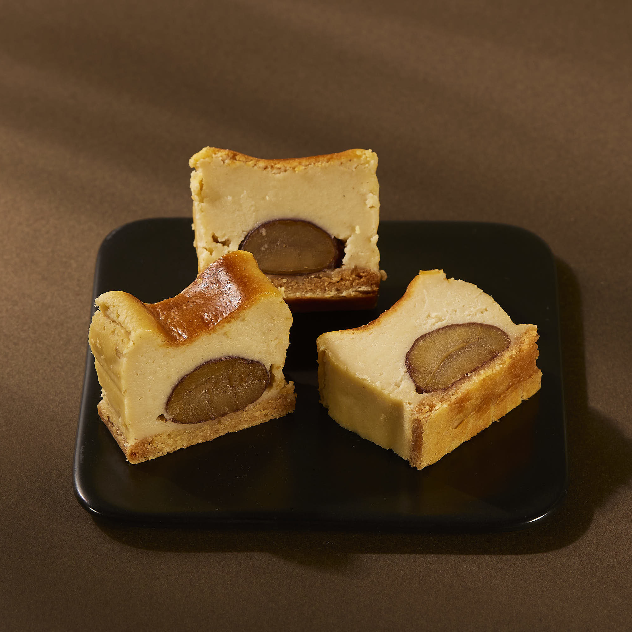 クッキー生地の上にまるごとの栗をぎっしりと並べ、北海道産のクリームチーズ、茨城県産「利平栗」を使用した濃厚なチーズケーキを流し込み、じっくりと焼き上げました。