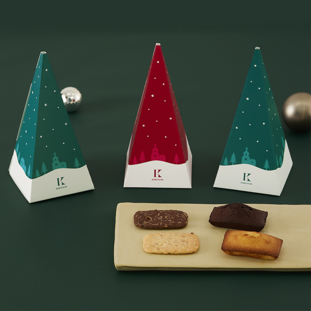 芳醇な発酵バターとアーモンドが香るフィナンシェと 薄焼きで軽い食感のきのとやクッキーをツリー型のBOXに入れました。