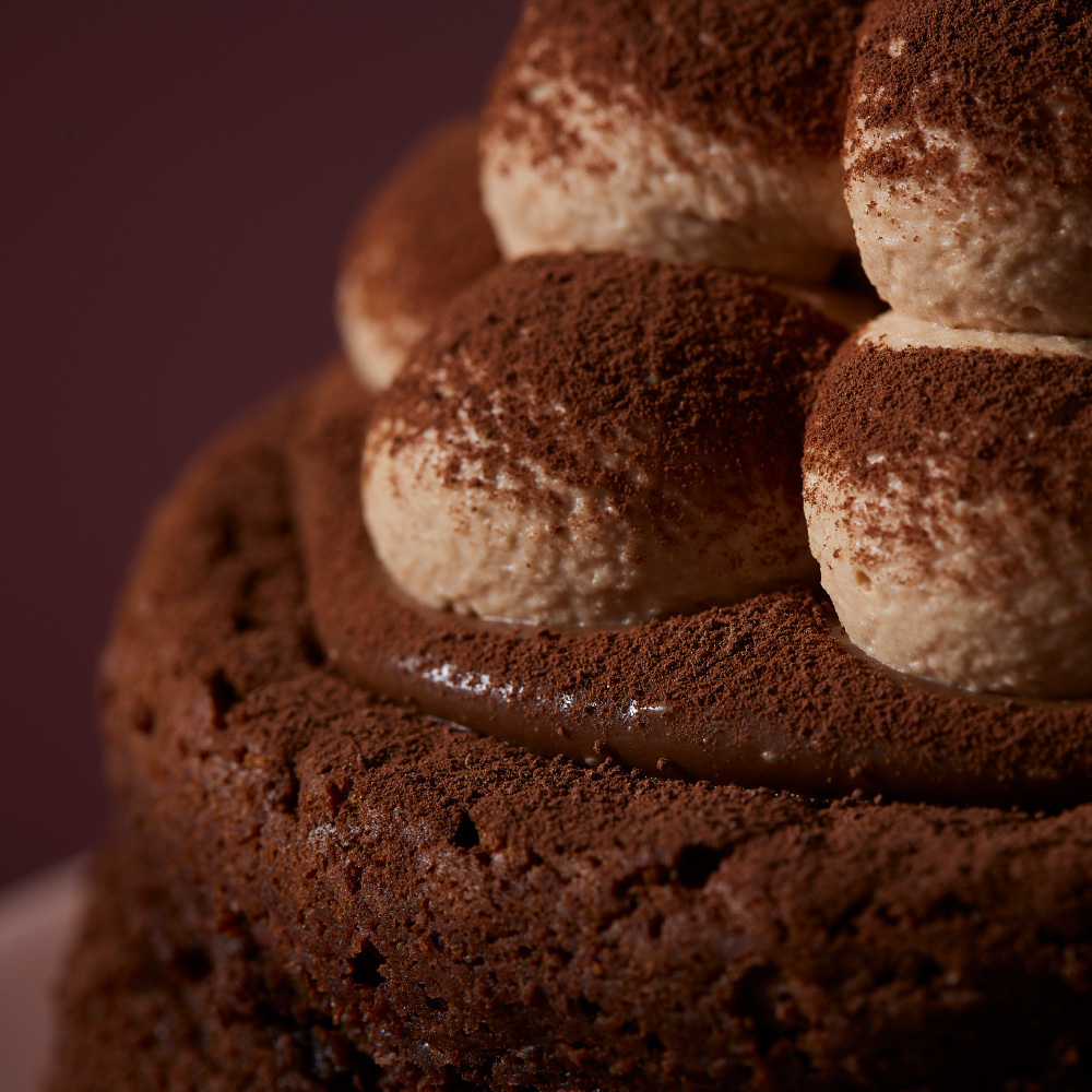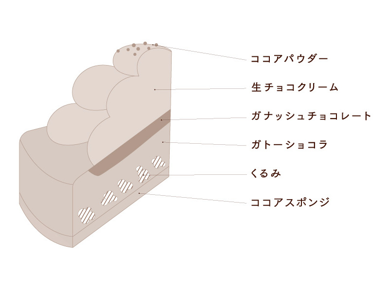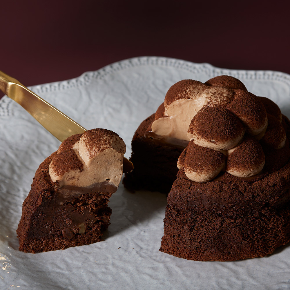 しっとりと焼き上げたガトーショコラとなめらかなガナッシュチョコレートのずっしり濃厚な味わいに、軽い口溶けの生チョコクリームを一緒にお召し上がりいただくことで、チョコレートの贅沢な味わいを最後まで飽きずにペロリとお召し上がりいただけます。