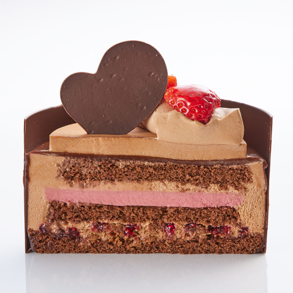 【販売期間】2月7日~2月14日 ショコラムースとフランボワーズムース、ココアスポンジを重ね、チョコレートを巻いて一つひとつ丁寧に仕上げたひと品。ベリーの華やかな酸味と、ショコラの濃厚な味わいを楽しめる、パティシエこだわりのショコラケーキです。