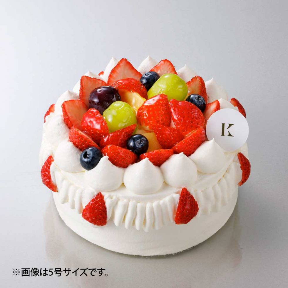 ふわふわなスポンジにフレッシュな生クリーム、いちご、2種のぶどう、ピーチ、ブルーベリーで華やかにデコレーションしました。