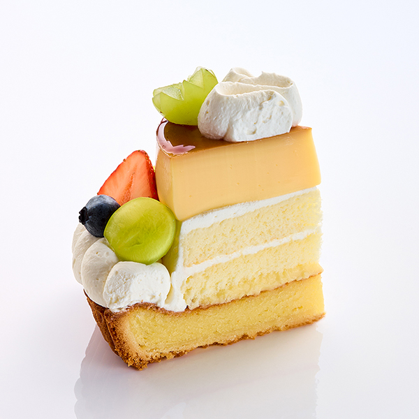 自家製のカスタードプリンの優しい風味とフルーツの彩りをお楽しみいただけるデコレーションケーキです。