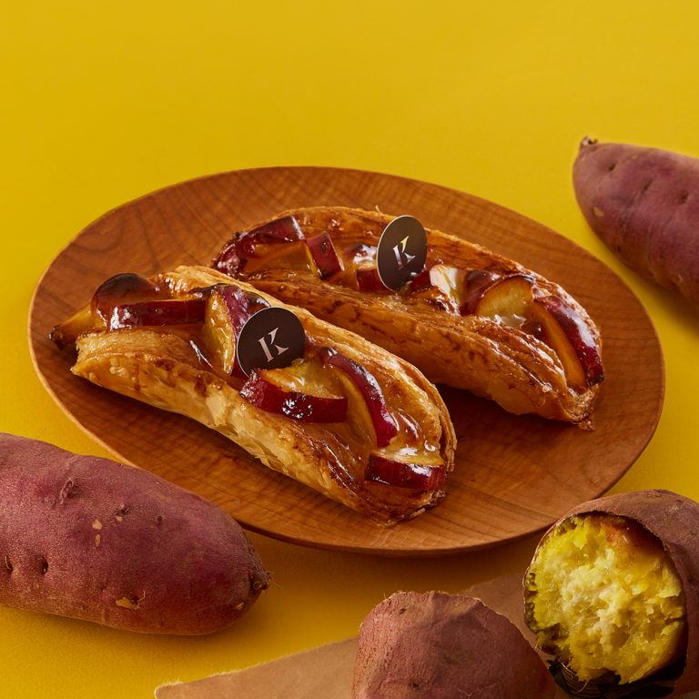2度焼きしたサクサクのパイに、さつまいものペーストとカスタードクリームを合わせたフィリングを詰め、甘く煮たさつまいもをのせました。
