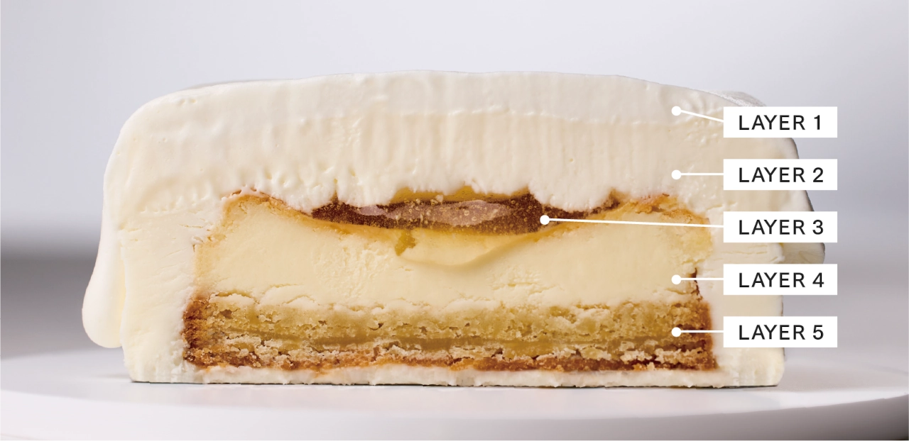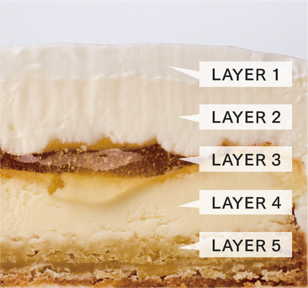 お菓子のおいしさを追求し、北海道産を中心とした原材料を独自ブレンド。手間を惜しまず生ケーキ作りの技術を積み重ねた5 層では、ふんわりとろり、しっとりといった、様々な表情が楽しめます。