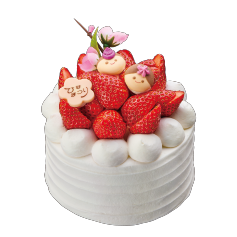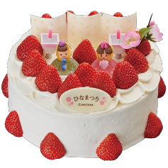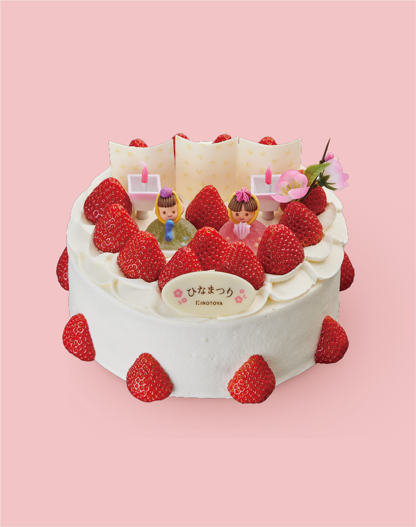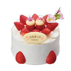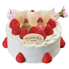 おひな様とたっぷりのいちごをずらりと飾った特別なケーキ。ふわふわなスポンジにフレッシュな生クリームとスライスイチゴをサンドしました。サクラ型のチョコレートや生クリームで彩り華やかに飾った、2段ケーキです。