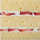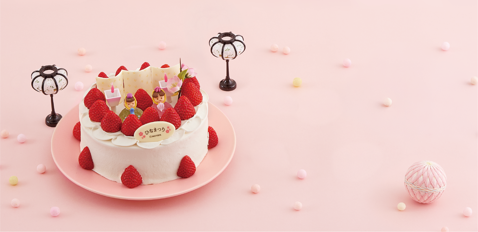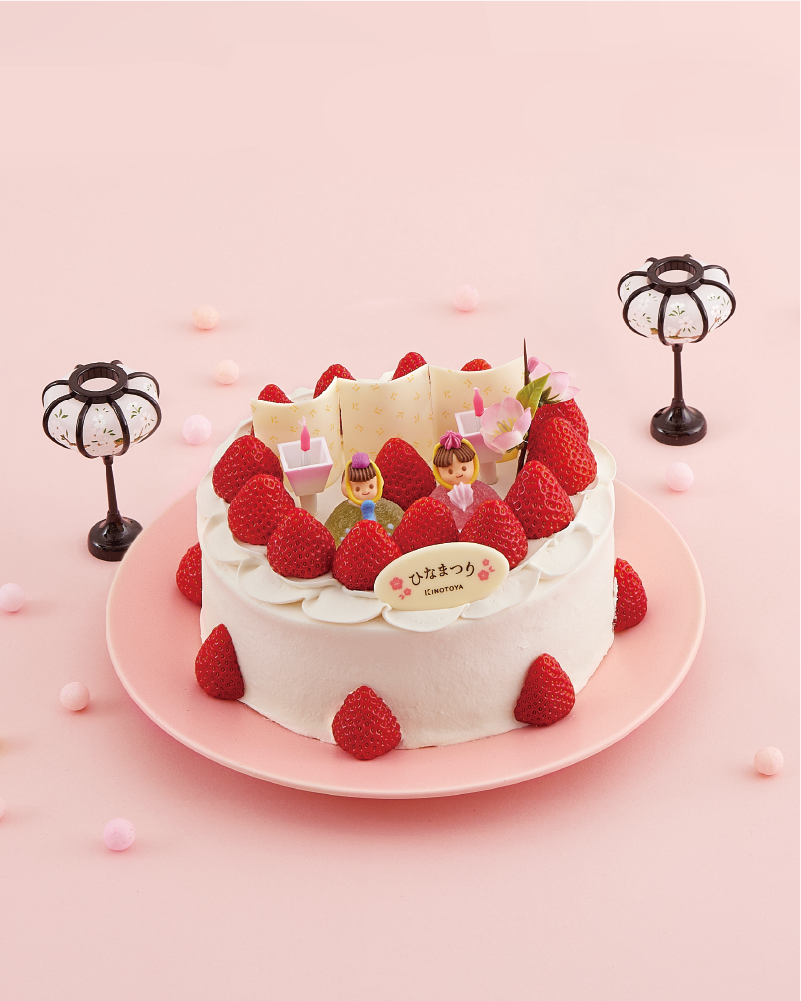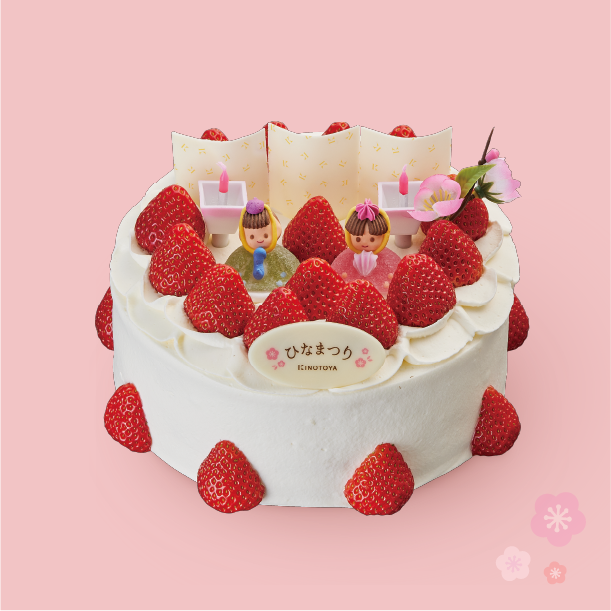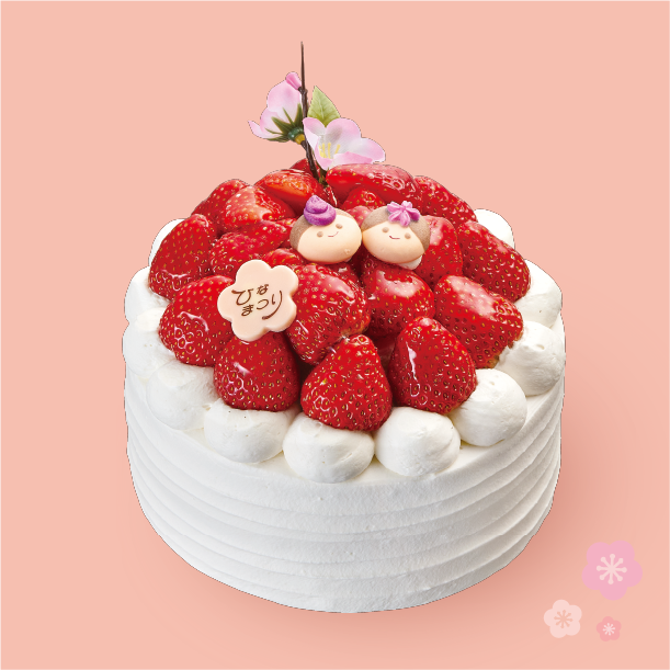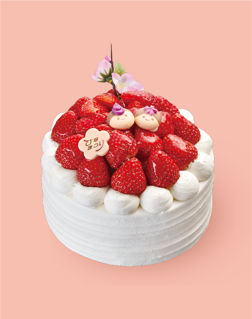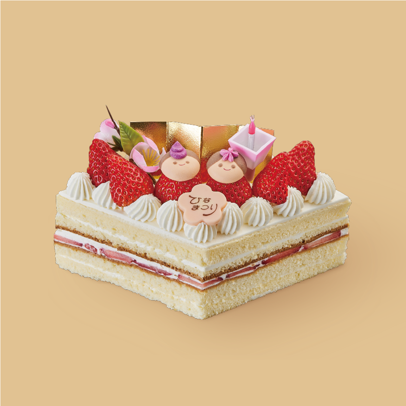 いちごとおひな様を可愛らしく並べ、フレッシュな生クリームとスライスイチゴをふわふわなスポンジでサンドしました。