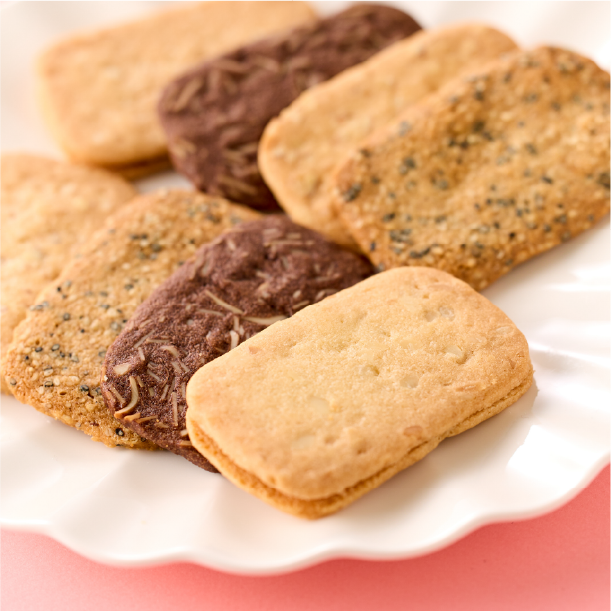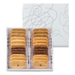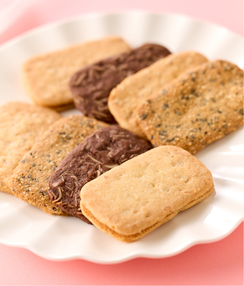 発売から、お客様に長く愛され続けているクッキーです。繊細でサクッと軽い口当たりで老若男女問わずお召し上がりいただけます。アマンド、ショコラ、マカダミア、セサミの4種類の味わいをお楽しみください。