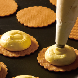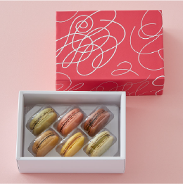 マカロン生地の特徴である“アーモンド”は、上質なシチリア産を自社で挽いて使用しています。挽き立てのアーモンドパウダーで作ることで香りが立ち、外はサクッと中はしっとりとした美味しさです。ピンク色の限定パッケージでご用意いたします。