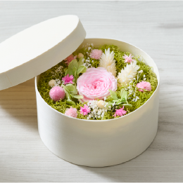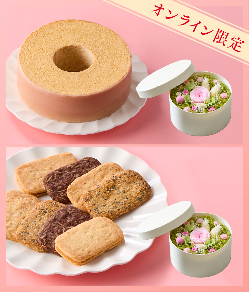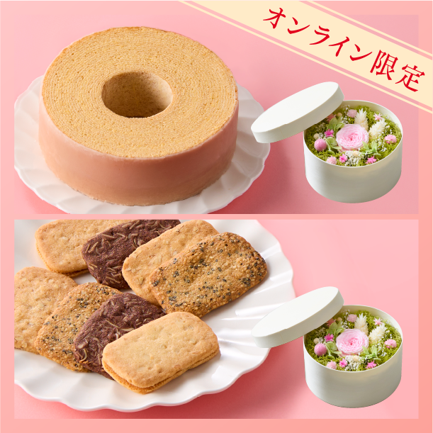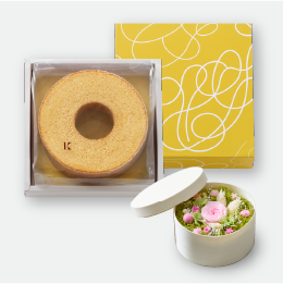 おいしいお菓子と美しいボックスフラワーを組み合わせた特別なギフトセット。上質な木製ボックスの中に、色鮮やかなプリザーブドフラワーを丁寧にアレンジしました。素材の風味や食感を大切にした4種に味わいの「きのとやクッキー」、北海道産の良質な素材にこだわり、しっとりやわらかな口当たりの「きのとやバームクーヘン」の2種類のセットをご用意しております。