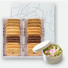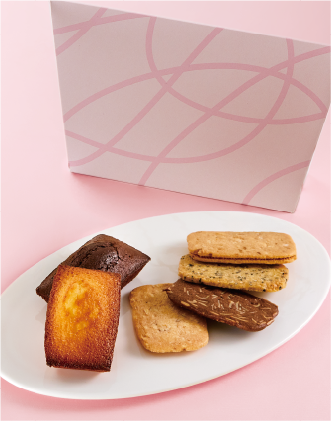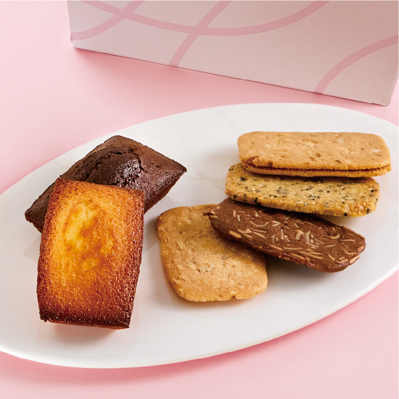 芳醇な発酵バターが香るフィナンシェバターと、深い香りと味わいのフィナンシェショコラ、繊細でサクッと軽い食感の4種類のクッキーをピンク色の限定パッケージに詰め合わせました。