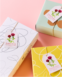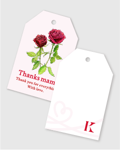 バラをあしらった特製メッセージタグ付きラッピングをご用意しました。