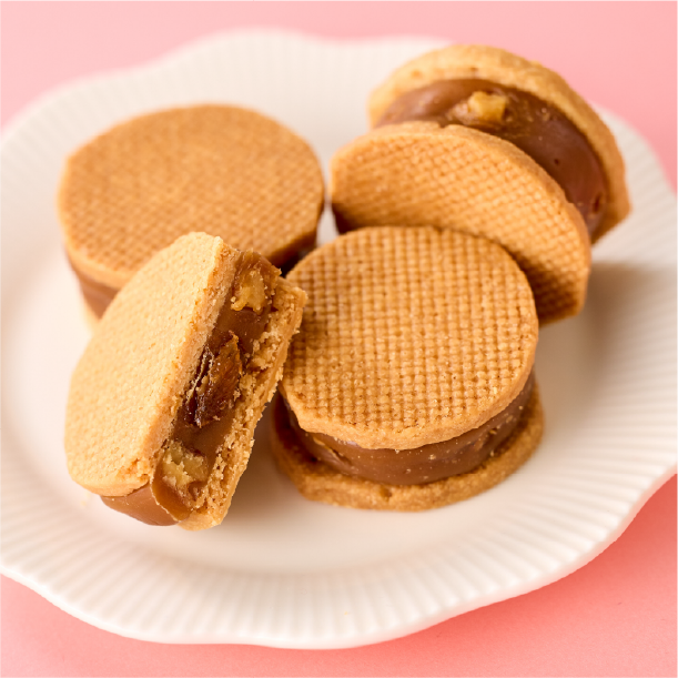 香ばしくローストしたくるみと、北海道余市の赤ワインで漬けたレーズンをやわらかなキャラメルクリームと、アーモンドを入れ香ばしく焼き上げたクッキーでサンド。厚みのあるキャラメルクリームとサクサクのクッキーが絶妙です。
