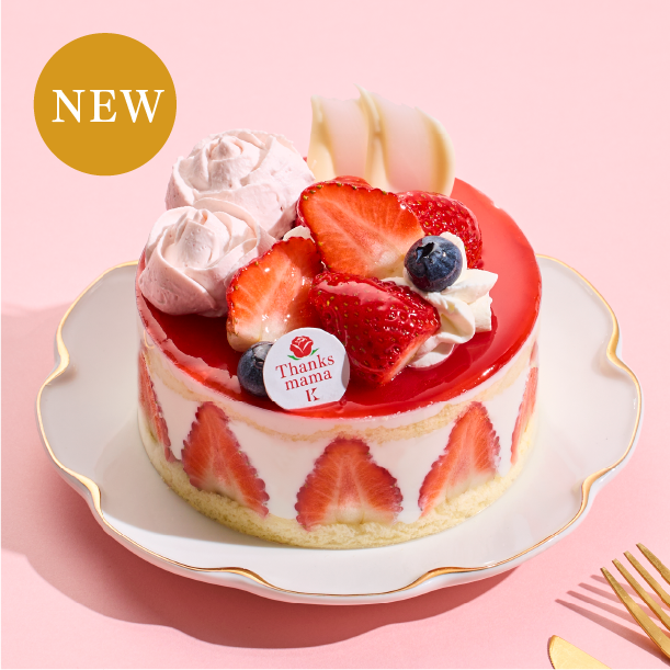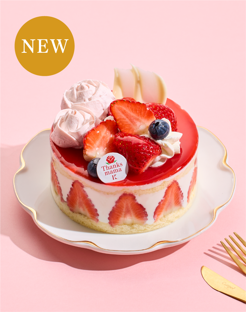 イチゴ風味の生クリームで一輪一輪絞ったお花を添えた、愛らしいイチゴのケーキ。スライスイチゴと生クリームをふわふわなスポンジに重ね、真っ赤なベリーのグラサージュをかけて華やかに仕上げました。お母さんへ感謝の気持ちを込めて贈りたいケーキです。
